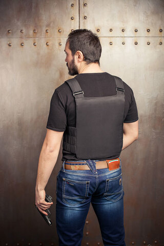 Это самый современный легкий, тонкий, гибкий из применяемых бронеэлементов. Также он не стесняет движений. Наличие дополнительной бронепанели из гибкого пластика обеспечивает дополнительную защиту от пистолетов ТТ и ПСМ.