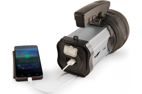 На задней поверхности фонаря расположен разъем для подключения зарядного устройства и USB-порт, позволяющий использовать фонарь в качестве внешнего аккумулятора (повербанка). От встроенного аккумулятора фонаря емкостью 7000 мАч можно заряжать телефоны, планшеты и другие устройства с возможностью подзарядки через USB-порт.